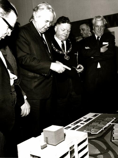 Prime Minister Harold Wilson inspecting a model of St. Cuthberts Village 1970